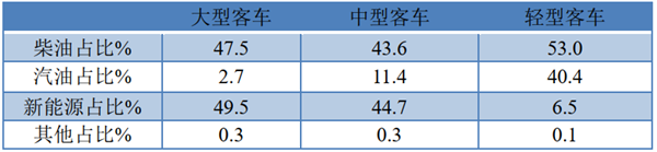 ●按发动机搭载的燃料种类划分,新能源在大型客车占比最大,柴油轻客仍是主力军