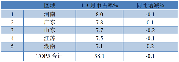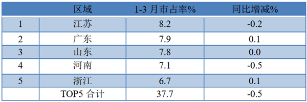 上表显示,1-3月大型客车流向江苏市场份额最大,同比减少0.2%,其次是广东区域市场,同比增加0.1个百分点,第三是山东区域同比也持平。TOP5累计占比37.7个百分点,同比减少0.5个百分点。