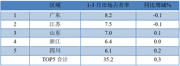 可见,1-3月轻型客车流向广东市场份额最大,同比减少0.1个百分点;江苏区域市场,同比也减少0.1个百分点 ;山东区域,同比增加0.1%。TOP5累计占比35.2个百分点,同比增加0.3%。
