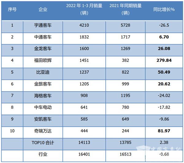 根据中国客车统计信息网数据,2022年1-3月6米以上客车Top10排行: