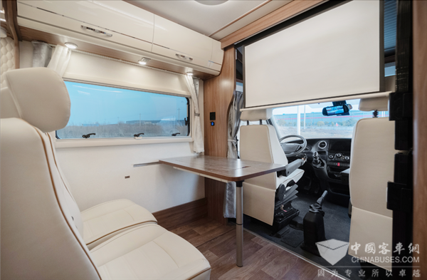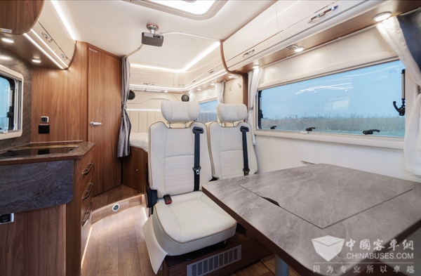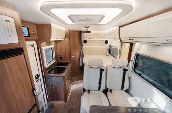 车内布局从前往后分别是会客区、厨房、后置纵床和卫生间。驾驶室上方大面积天窗,给予车内充分采光,让整个车内的通透感更强,让人身处其中不会感觉压抑与局促。会客区采用单排卡座的形式,乘用车座椅,皮艺耐磨面料沙发,U型头枕,乘坐舒适且安全。