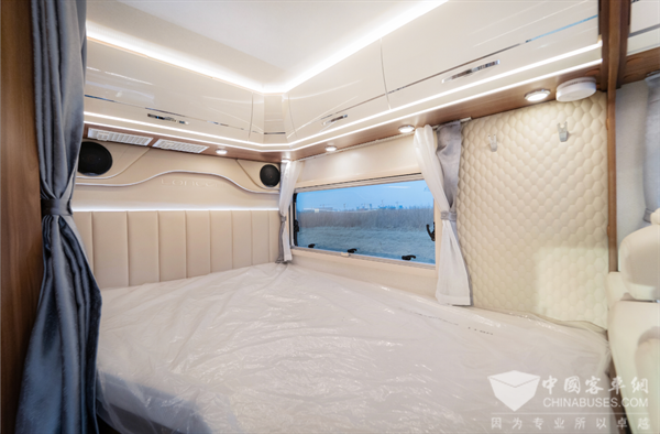 后置纵向双人床长1.9米,宽1.35/1.10米,侧面的大尺寸外推窗提供了采光与通风,头部贴心使用软包设计,配有阅读灯和氛围灯、隐私帘。下方配有一个三公斤洗烘一体机。