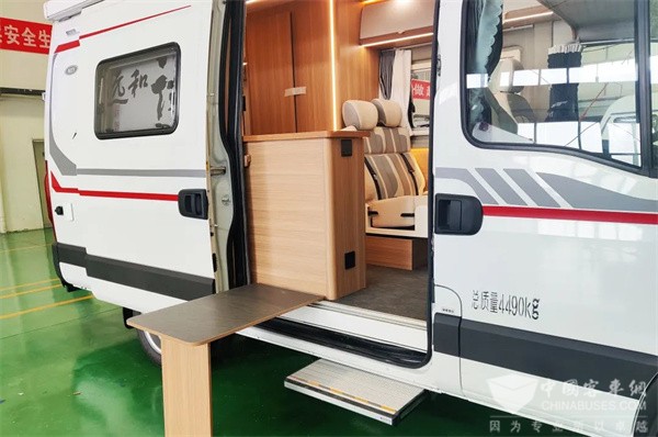 车侧配备有房车专用乘客门、手动遮阳棚、电动踏步、正副司机门防滑踏步、房车外接电源口(220V)、重力加水口等。车身外置翻板的配备,可以拓展厨房区的料理空间。