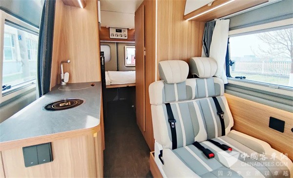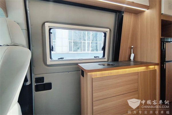 如果需要用到桌子,还可以使用会客区旁的厨房料理台。因为B型房车内部的空间较为紧凑,会客区和厨房区之间的距离并不是隔得非常远。如果想要放置物品,其实也就是伸个手的事。