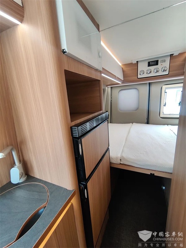 在厨房区一侧,还配有微波炉和118L房车专用冰箱,便于解冻或者冷藏食物。在微波炉和冰箱中间,还有个内嵌的储物柜,可以摆放小物件,增添生活气息。