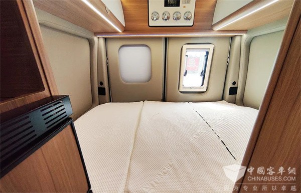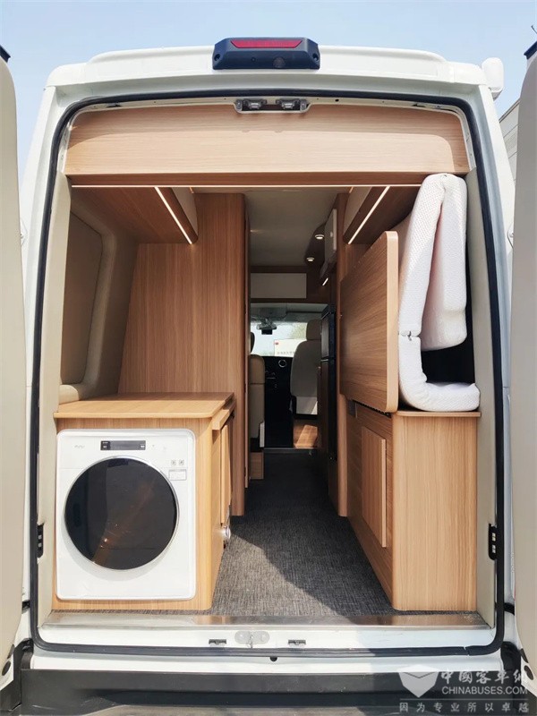 尾部采用双开门设计,床铺尾部配有洗衣机,户外出门也可以轻松解决洗衣问题。床铺可折叠翻折,下方可以作为储物空间,放置大件行李。