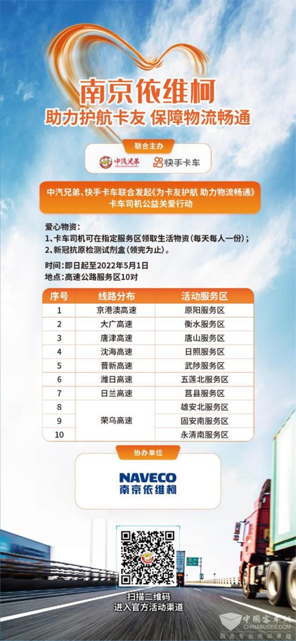 为切实保障货运物流畅通,南京依维柯携手其他爱心企业,积极加入由中汽兄弟、快手卡车联合发起“为卡友护航,助力物流畅通”关爱公益行动。在京港澳高速原阳服务区、大广高速衡水服务区、唐津高速唐山服务区、沈海高速日照服务区、晋新高速武陟服务区、潍日高速五莲北服务区、日兰高速莒县服务区、荣乌高速雄安北、固安南、永清南服务区等高速公路服务区,免费发放新冠抗原检测试剂盒,每一位卡车司机每天还可以领取一份生活物资,并对遭遇突发性、紧迫性、临时性基本生活困难的货车司机给予帮助,共度难关。