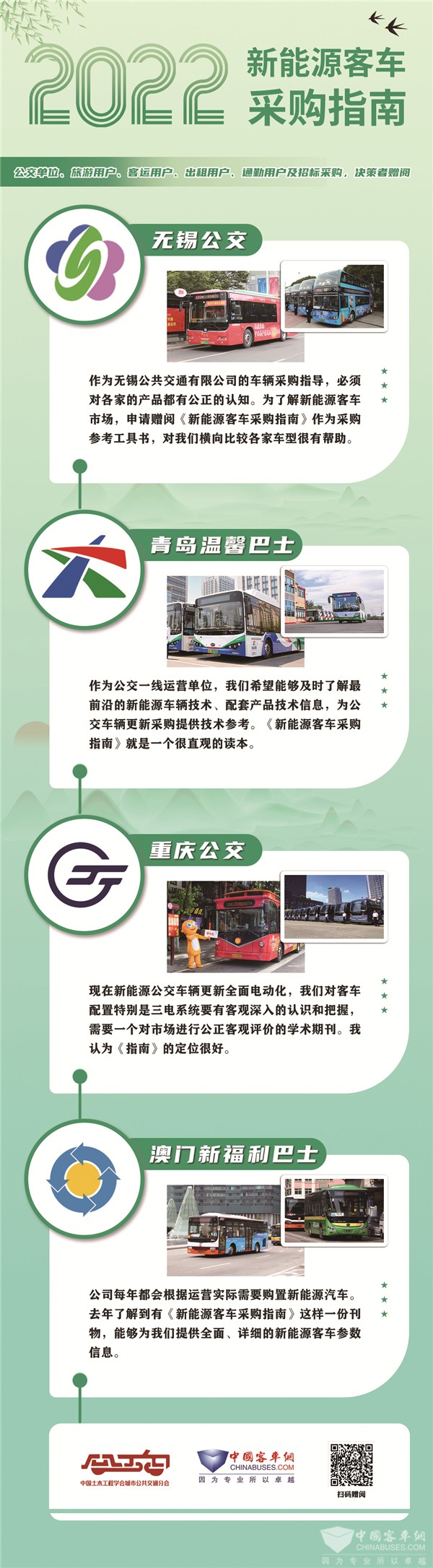 为了更好地辅助广大交运企业完成年度招标采购工作,完美作业网有免费视频联合中国土木工程学会城市公共交通分会开展《2022新能源客车采购指南》编撰工作,刊物编撰初衷来源于客车用户,发行对象也是客车用户,定位为典范式的招标采购“工具书”。