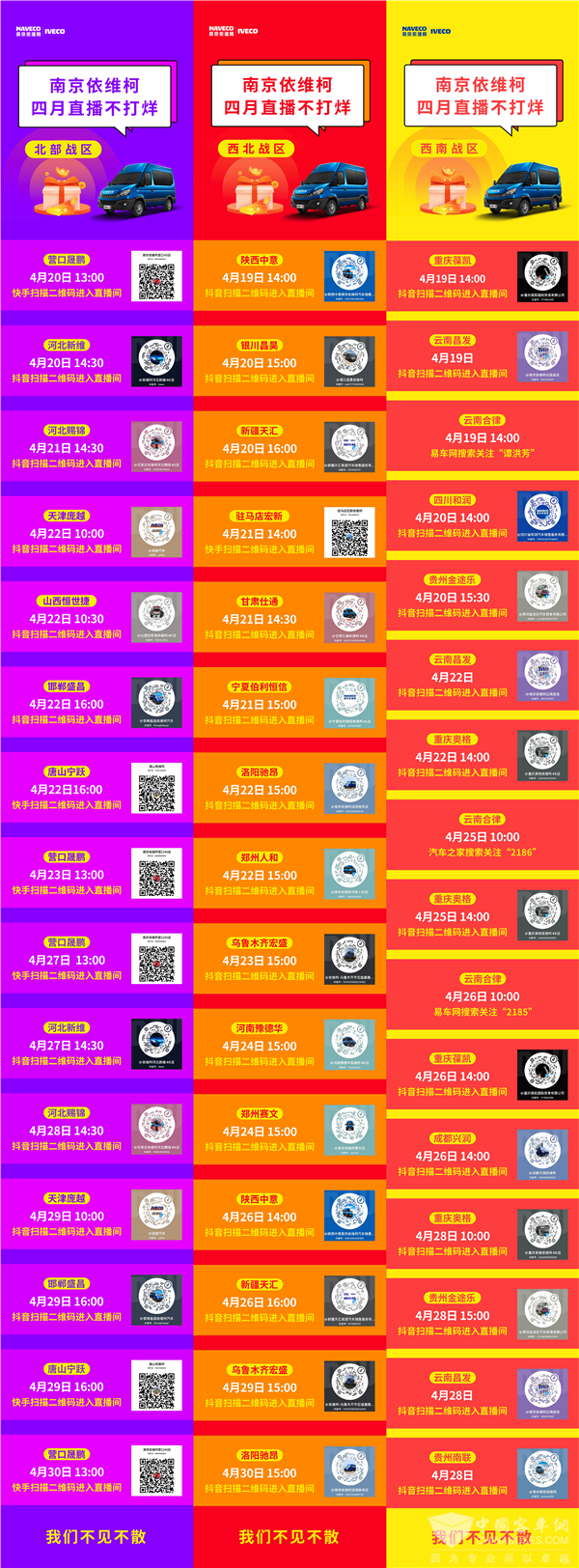 为给广大消费者提供更便利的看车、选车、购车平台,让大家买到称心、放心、舒心的轻客产品,即日起至2022年4月30日,南京依维柯“四月直播不打烊”线上直播活动,在抖音、快手、汽车之家、易车网等平台全面开启。