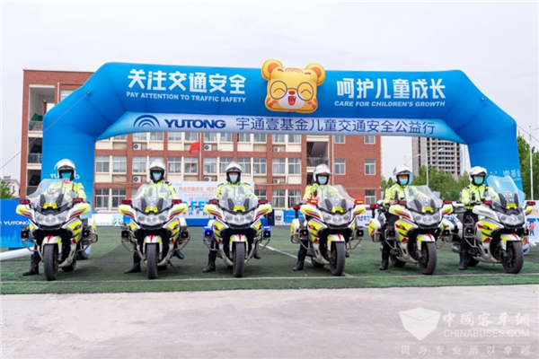 伴随着警笛声,身穿绿色警服的交警们驾驶着警用摩托车排成队列,为儿童交通安全保驾护航,正式拉开了2022年宇通&壹基金儿童交通安全公益行的序幕。