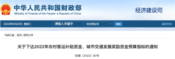 近日,财政部发布《关于下达2022年农村客运补贴资金、城市交通发展奖励资金预算指标的通知》,下达超241亿元奖补资金预算,支持农村客运和城市交通发展。