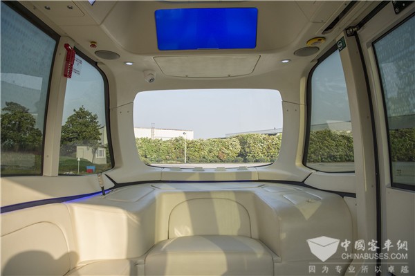据介绍,“深蓝”采用对称式移动太空舱设计理念,融入胶囊、宇航头盔设计元素,球形挡风玻璃再现了透过宇航员视野看世界的感受。内饰方面,“深蓝”采用移动休闲厅设计理念,星轨环绕式乘坐区,提供愉悦、自由、沉浸式的使用感受。整车人机方面,“深蓝”车内净高富余、一级踏步、侧跪功能、塞拉门等设计,提高上下车便利性;环绕式软包沙发、开阔视野、多彩氛围灯提升乘坐感受。此外,星空顶、液晶显屏,提供视野延展与信息实时交互;远程启动控制、APP叫车,提升便利性。