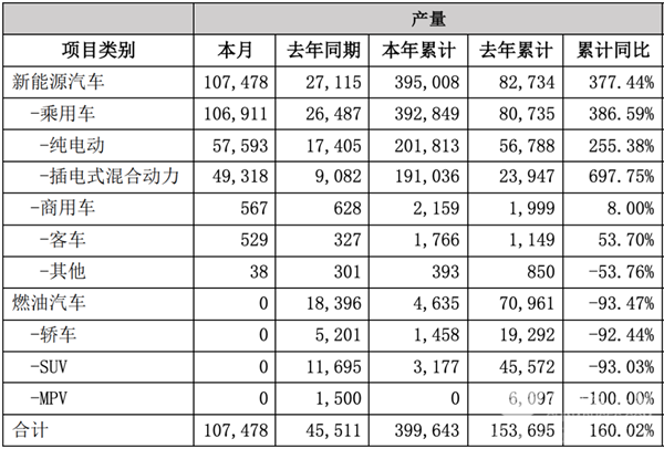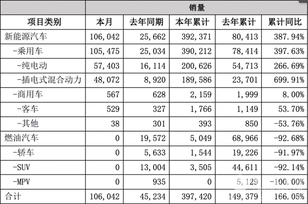 2022年5月4日,比亚迪股份有限公司(下称“比亚迪”)发布2022年4月产销快报。快报显示,比亚迪4月份销售新能源汽车106,042辆,同比增涨313.23%;1-4月累计销售新能源汽车392,371辆,同比暴涨387.94%。