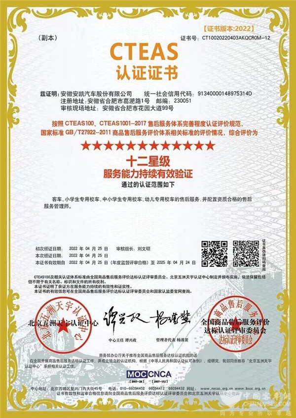 行业权威认可 安凯荣获国内最高CTEAS十二星级等级认证!
