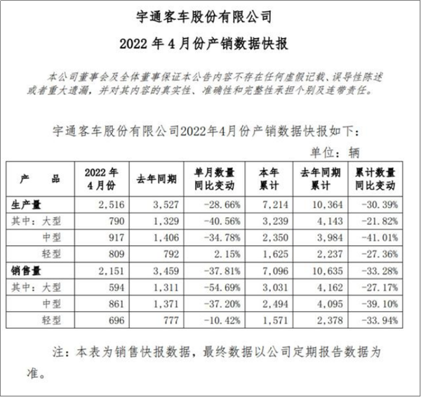 2022年5月8日,宇通客车发布2022年4月份产销数据快报。数据显示,4月份,宇通共生产大、中、轻型客车2516辆,同比下降28.66%;共销售各型客车2151辆,同比下降37.81%。2022年1-4月,宇通累计生产各型客车7214辆,累计销售各型客车7096,较去年同期分别下降30.39%和33.28%。