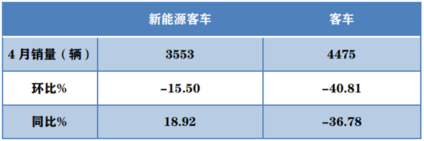 上表可见,4月新能源客车销量3553辆,环比下滑36.78%,同比增长18.92%,均跑赢4月客车大盘环比(-40.81%)和同比(-36.78%)的增速。可见,新能源客车是抑制4月客车市场下滑的主要“功臣”。