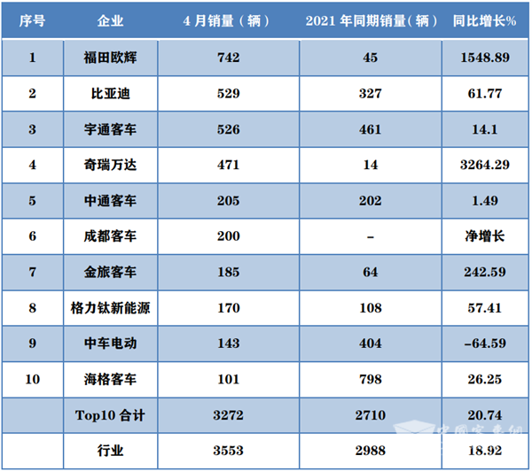 2022年4月新能源客车销量Top10同比统计(数据来源:中国客车统计信息网):