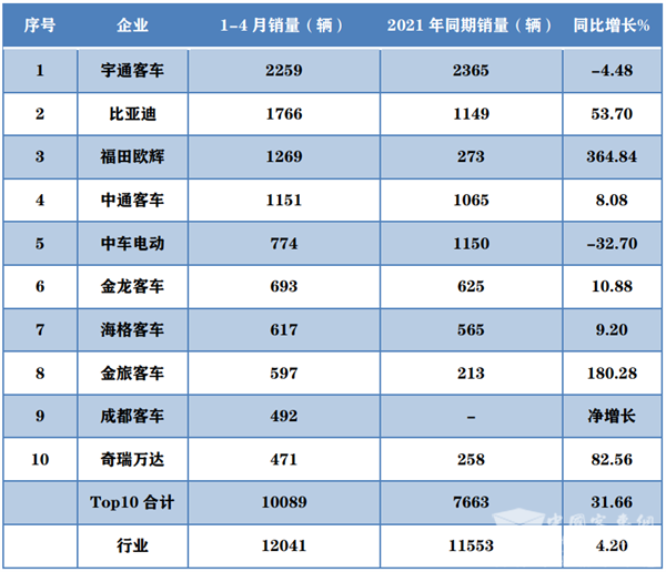 2022年1-4月新能源客车销量Top10同比统计(数据来源:中国客车统计信息网):