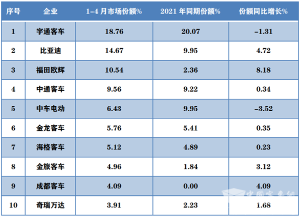 从上表看出,2022年1-4月新能源客车Top10中市场份额变化特征是: