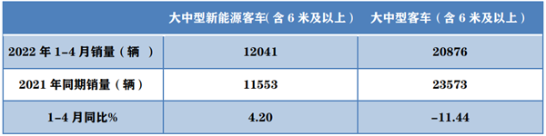 2022年1-4月新能源客车销量同比与客车大盘比较(数据来源:中国客车统计信息网):
