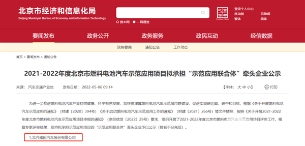 近日,北京市经济和信息化局发布了《2021-2022年度北京市燃料电池汽车示范应用项目拟承担“示范应用联合体”牵头企业公示》,根据专家评审结果,北汽福田汽车股份有限公司上榜示范应用项目的“示范应用联合体”牵头企业。