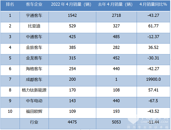 根据中国客车统计信息网数据,2022年1-4月6米以上客车Top10排行: