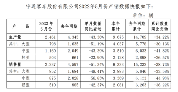 2022年6月6日,宇通客车发布2022年5月份产销数据快报。数据显示,5月份,宇通共生产大、中、轻型客车2461辆,同比下降43.36%;共销售各型客车2237辆,同比下降51.34%。2022年1-5月,宇通累计生产各型客车9675辆,累计销售各型客车9333,较去年同期分别下降34.22%和38.73%。