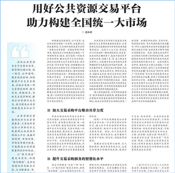 6月7日,《湖北日报》刊发湖北省交易(采购)中心党组书记、主任胡俊明的署名文章,对公共资源交易和政府采购领域贯彻落实习近平总书记在中央深改委第五、七次会议上的重要讲话精神和《关于加快建设全国统一大市场的意见》(以下简称《意见》)要求,提出了符合该省交易采购平台建设实际的“路线图”。这是全国贯彻落实今年4月中共中央、国务院印发的《意见》的首张省级“路线图”,也旗帜鲜明地打响了加快建设全国统一大市场的“第一枪”。
