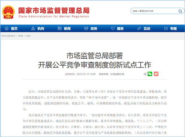 特别是自今年4月《意见》从全局和战略高度对加快建设全国统一大市场作出部署以来,全国日渐形成抓落实、重实效的良好氛围。5月,市场监管总局在9省(市)组织开展公平竞争审查制度创新试点工作,其中,在江苏、重庆开展公平竞争审查信息化建设试点,在天津、吉林、上海、浙江、山东开展公平竞争审查会审试点,在安徽、广东开展公平竞争审查举报处理试点,在浙江、广东试点编制公平竞争指数,更高水平、更深层次、更大力度促进全国统一大市场和高标准市场体系建设。