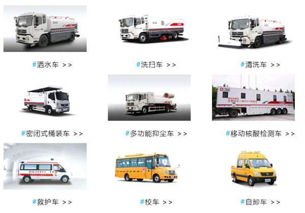 新能源专用车:针对城市清洁、城建运输,医疗救护、工程、教育等公共服务或特殊领域交通运输需求,开发了一系列环卫车、渣运车、移动核酸检测车、救护车等专用车型,为城市提供绿色智慧出行一体化服务。