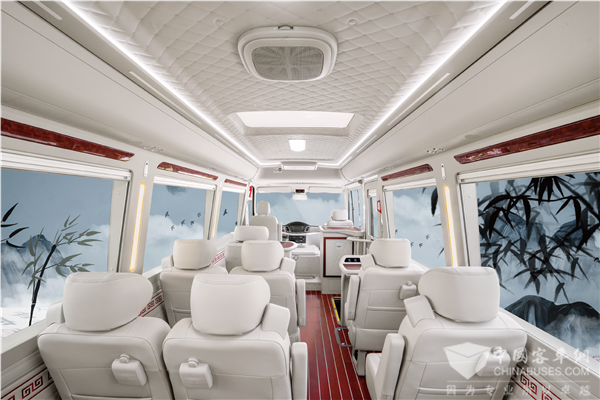 当然,除了本身过硬的质量之外,宇通T7星宇版的颜值也是不容忽视的。从外观上看,车辆沉稳大气、飘逸流畅。走进车内,国风味十足的回形纹设计,行星环车顶氛围灯,典雅时尚的菱形皮革包覆,游艇级柚木地板等内饰,让高端公商务车的气质尽显无疑。