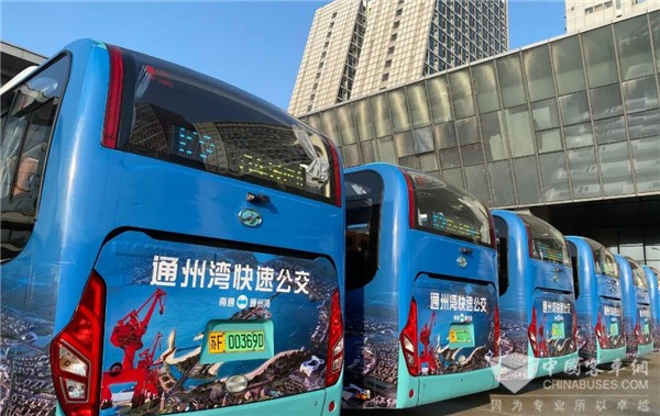 此次开通线路为两条,由南通汽运集团下属南通飞鹤公交与通州湾飞鹤公交对开共营,K1线路为华联至通州湾商务大厦,K2线路为汽车客运东站至通州湾商务大厦,中途均停靠通州湾汽运中心。两条直达快线共投入20辆苏州金龙海格KLQ6111ZGEVN新能源客车,车身11米长,外形大气时尚,设计素材选取通州湾俯瞰图结合天然原生态蓝色港湾的自然景观,整体画面凸显空灵大气、主题突出。