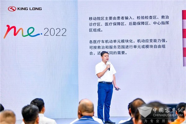 发布会上,金龙客车专用车事业部总经理刘孔斌,向来宾发布并讲解金龙移动医院医疗服务方案。金龙客车专用车事业部专注打造国内领先专业的顶级改装车企业,拥有康养、安防、商旅、营商四大产品族群,连续三年销售额实现阶梯式增长。医疗车板块是康养产品族群的重要组成部分,发展至今已经从满足单一的移动治疗需求升级到涵盖六大板块的移动医院解决方案,采血车、体检车、CT车、救护车、手术车、血浆运输车、核酸检测车、移动口腔车等系列产品可自由组合成移动院区,实现多场景下的精准、快速、可靠、普惠和远程的移动医疗服务。