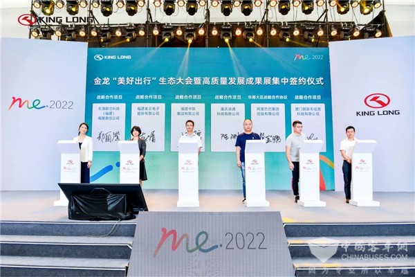 在清晰呈现企业现阶段的高质量发展成果与发展方向后,福汽集团董事长陈建业宣布金龙“美好出行”生态圈启动,与会领导、战略合作伙伴、行业用户一同上台,共襄盛举,并现场进行集中签约仪式。