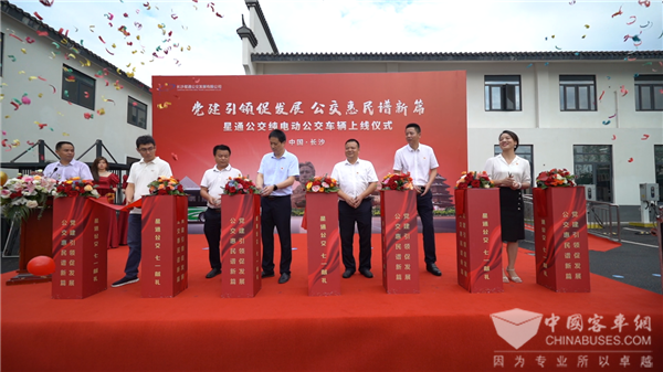 党建引领促发展,公交惠民谱新篇。在庆祝中国共产党建党101周年之际,湖南长沙县迎来惠及民生的又一大事。2022年6月30日,长沙星通公交发展有限公司(以下简称“星通公交”)纯电动城乡公交车上线运营仪式在浔龙河公交枢纽站举行。长沙县交通运输局、星城发展集团、星通公交及相关客车企业负责人出席活动。其中,79辆新款8.1米宇通宇光造型纯电动高端公交车将作为主力,推动长沙县城乡公交一体化进一步落实,让人民群众实现更美好出行。