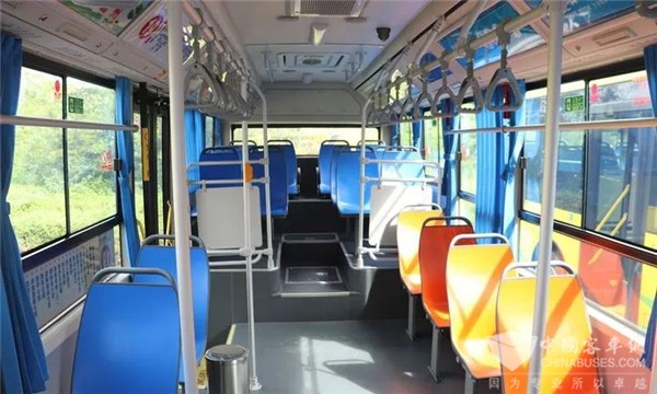 登上蔚蓝公交,车内爱心座椅区采用明亮的橙黄色,洋溢着温暖的感觉。其他区域采用蓝色座椅、磨砂质感的地铁扶手,营造出安全静谧的乘车环境。
