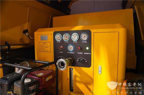 车辆携带的压缩空气泡沫灭火系统,体积小巧灵活,采用电力驱动,可固定安装也可移动使用。该系统只需负载一种灭火药剂(A类泡沫),产生扑灭A类火灾泡沫的同时,可根据需要调节A类泡沫比例,产生扑救普通B类火灾的泡沫,一机两用。另外,高效省水是这套系统的另一个突出特点。一滴水经过该装置变成七个气泡(气液比7:1),每个气泡的灭火效能和一滴水相同,灭火效能高,与纯水灭火比较,灭火效率可达20倍,水的利用率提高到8倍,这对于大部分城中村和偏远村镇缺少市政消防设施,无消火栓、消防水池等补水设施的地区来说,意义重大。