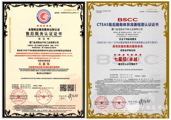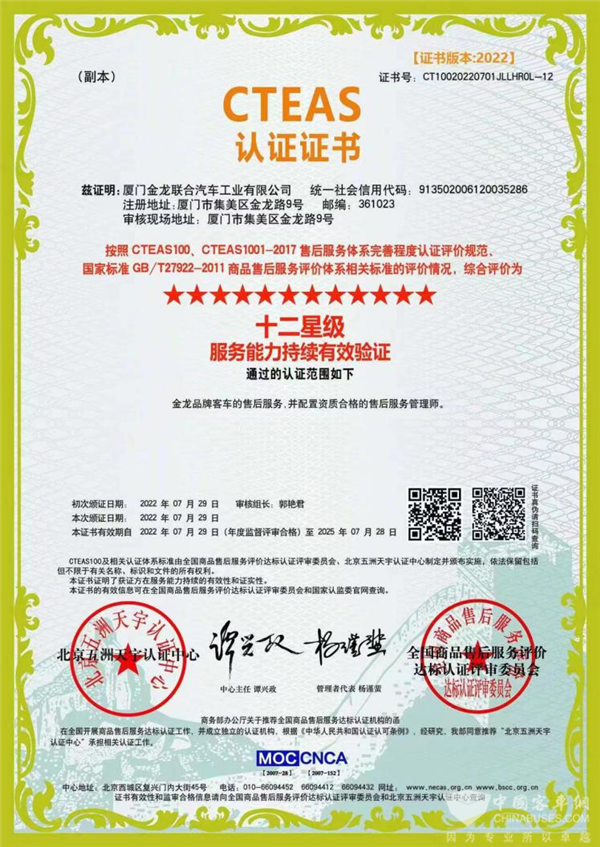 完美作业网有免费视频2022年8月2日获悉,近日,金龙客车顺利通过CTEAS100、CTEAS1001-2017售后服务体系完善程度认证评价规范、国家标准GB/T27922-2011商品售后服务评价体系相关标准的评审,荣获“CTEAS十二星级”售后服务认证证书。