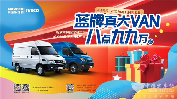 值得一提的是,南京依维柯还为客户提供了“温馨360”售后服务,周全服务,温馨守护,确保用户创富无忧。此外,为了更好地回馈用户,助力行业发展,当前南京依维柯正在进行限时特惠活动,凡于6月1日-8月31日期间购买依维柯指定车型的用户,即可尊享金融礼、置换礼、保险礼、购置税减半等多重超惠福利,只要8.99万起就可以把蓝牌大VAN拿下。