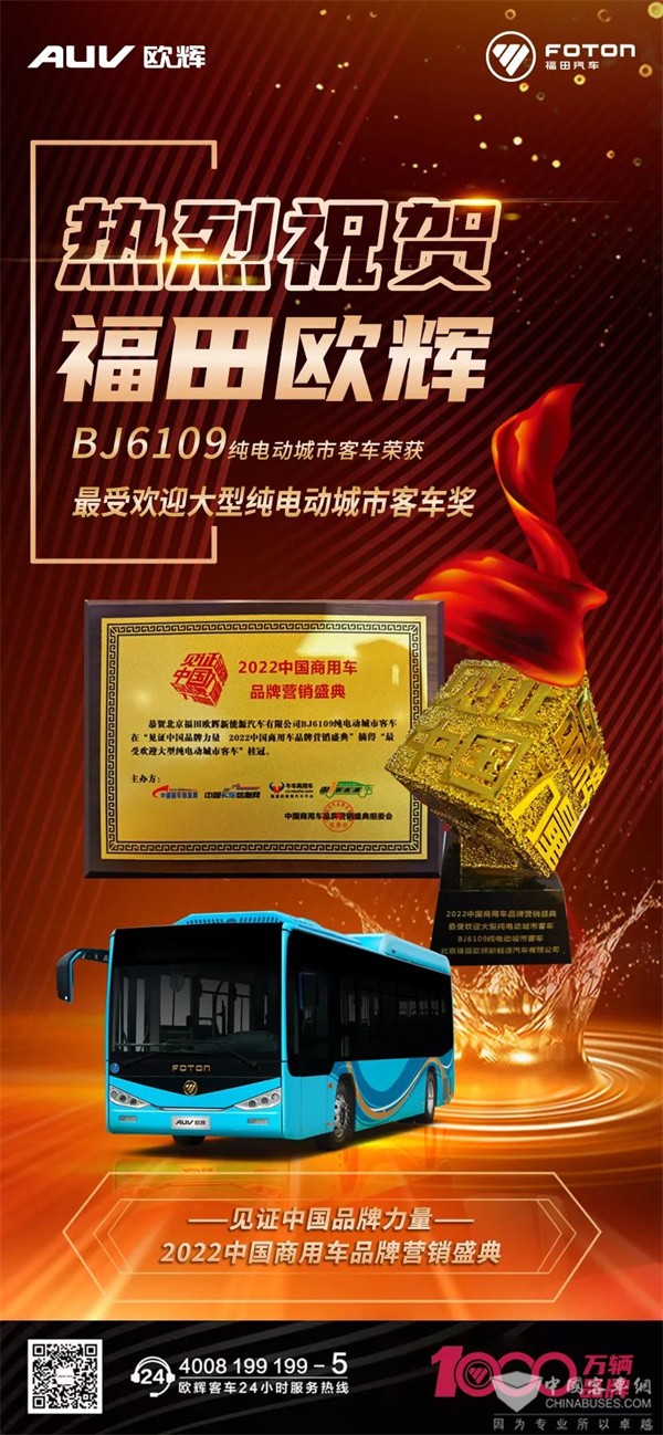 2022年8月8日,“见证中国品牌力量——2022中国商用车品牌营销盛典”在北京隆重举办。在这场面向整个商用车行业的大比武中,福田欧辉BJ6109纯电动城市客车展现出卓越的产品性能和技术能力,荣获“最受欢迎大型纯电动城市客车奖”。