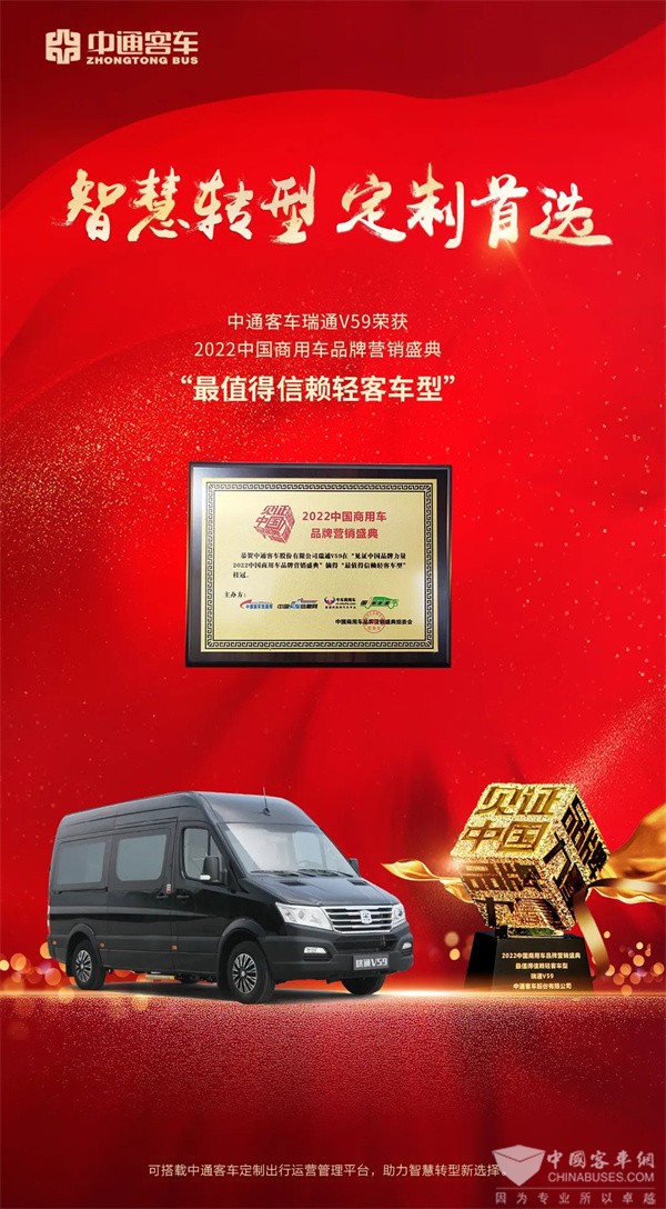 2022年8月8日,见证中国品牌力量——2022中国商用车品牌营销盛典”在北京隆重举办。凭借出色品质,中通瑞通V59 成功斩获“最值得信赖轻客车型奖”。