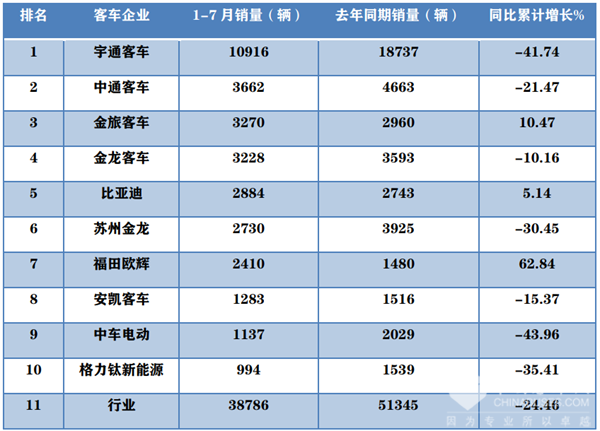 宇通夺冠 金旅榜眼 开沃逆势领涨 7月大中型客车销量遭“双降”