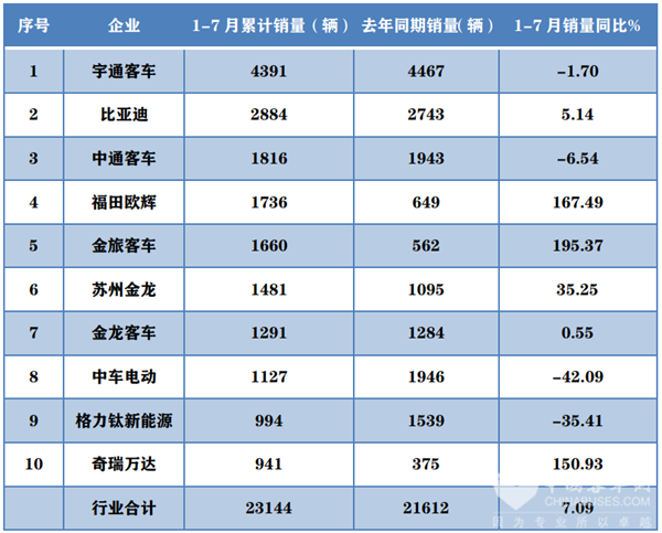 根据中国客车统计信息网数据,2022年1-7月Top10 企业大中型新能源客车累计销量及同比增长: