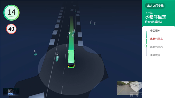随着车门关闭,自动驾驶巴士自行启动并开始按照规划线路行驶,方向盘全程自动调整方向。仅有一名安全员全程监督保证车辆行驶安全。据了解,自动驾驶巴士目前行驶的线路为东方之门专线,沿途共有李公堤东、水巷邻里东、水巷邻里西、李公堤西等5站,全程行驶路线形成闭环,合计用时20分钟左右。在乘客区的左前方,一块硕大的智能驾驶显示屏幕以3D渲染技术清晰地展示出巴士目前的运行轨迹以及它所“看到”的周围所有物体。无论是正在修建的路面、穿越斑马线的行人,还是左侧超车行驶的轿车,自动驾驶巴士都清晰无误地识别并反馈到了显示屏幕上。