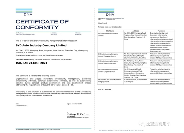 DNV集团作为全球最具公信力及最早进入中国地区的国际认证机构之一,认证业务始终秉持技术领先的优势,获得超80个国家授信认可,累发各类管理体系证书超6.5万张。本次DNV对比亚迪颁出其在商用车领域的全球首张ISO/SAE 21434证书,既是对比亚迪商用车网络安全体系管理的充分肯定,也是对比亚迪技术领先、品质领先的又一次权威背书。