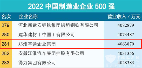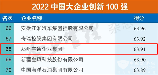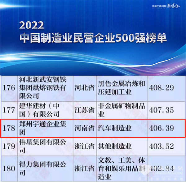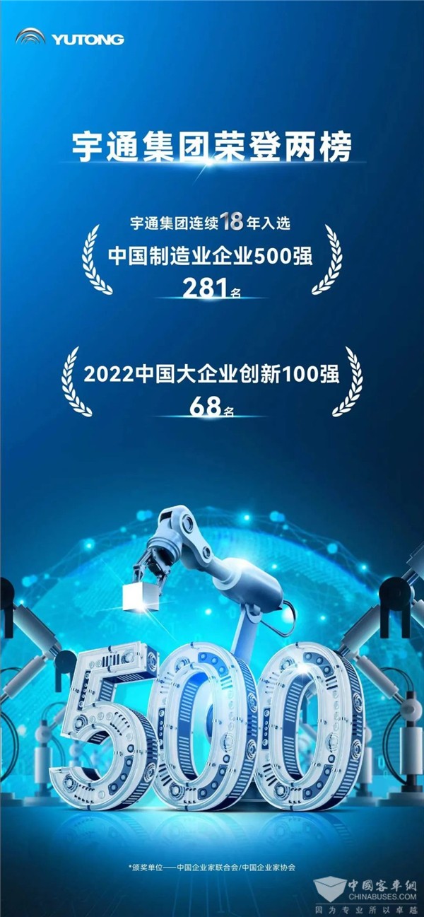 2022年9月6日,中国企业联合会、中国企业家协会联合发布了“2022中国制造业企业500强”、“2022中国服务业企业500强”“2022中国大企业创新100强”等榜单,本次宇通集团荣登“2022中国制造业企业500强”和“2022中国大企业创新100强”,这是宇通连续18年上榜“中国制造业企业500强”榜单。