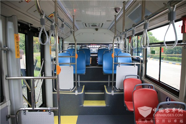 此外,车内细节设计十分人性化。例如,车厢采用了全新造型顶棚,配置LED长条灯,美观的同时也营造出温馨的驾乘环境;乘客区采用不锈钢带加热扶手,在冬季站立区乘客抓握扶手的触感更好;公交版的乘客区座椅采用斜腿设计,既美观又方便卫生清扫。