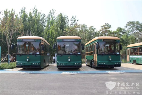 格力钛新能源铛铛车,外形酷似民国有轨电车,车身喷涂“青碧绿”亚光油漆,搭配皮革座椅,铺设棕红色地板、仿古黄车顶、仿旧顶灯和别致手环,以现代工艺呈现复古韵味;具有零排放、噪音小等特点,在保护自然生态系统的同时,推进景区生态环境治理工作,助力景区旅游发展。