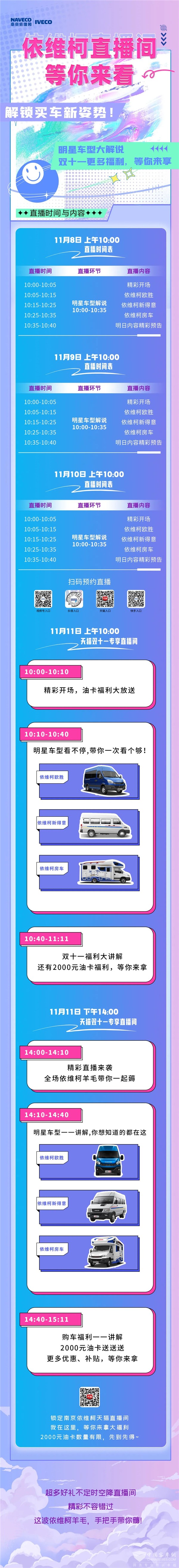 11月8日-11日,南京依维柯将在抖音、快手、视频号、天猫等南京依维柯汽车官方平台直播狂欢购。届时,直播期间内南京依维柯旗下依维柯欧胜、新得意、房车将相继亮相,经验丰富的主播们会结合具体车型的性能优势做出详细介绍,让大家足不出户便可深入了解产品。值得一提的是,11月11日,锁定南京依维柯天猫直播间,还有2000元油卡派送福利,数量有限,先到先得。令人惊叹的是,天猫商城的惊喜还远远不止于此,本月凡在该平台下单购车的用户,还有机会享受专属“万元购车礼”。南京依维柯如此宠粉,只为让大家过一个“有礼有面儿”的“超燃购车月”!