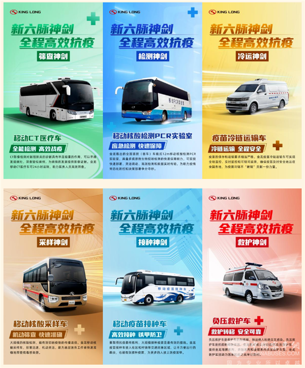 新冠疫情发生之后,金龙自主研发的“疫苗冷链车、疫苗接种车、核酸采样车、核酸检测车、负压救护车和移动CT医疗车”全套抗疫车型,从疫苗冷链、疫苗接种、核酸采样,再到核酸检测、患者负压运输、CT检测,涵盖六大板块的移动医院解决方案,高效助力新冠疫情防控的每个环节。